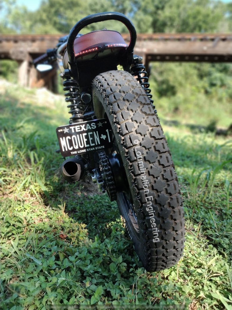 Air is supplied to the motor via single-pod style air cleaners attached to each carburetor. Instead of a painted tank, the McQueen-1 features a sanded-down and slightly rusted look, called "patina". |