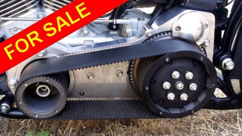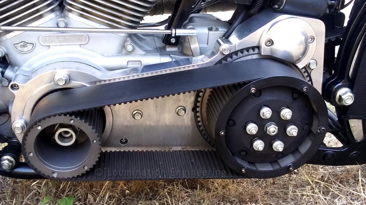 dry clutch in an open basket and the famous 85mm (3.35") belt drive.