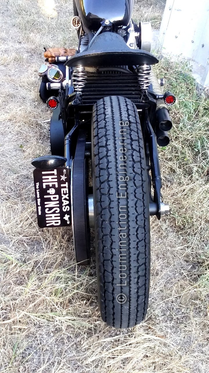 Oil in an air-cooled engine benefits from all cooling so an oil cooler fitted under the rider seat allows the engine to run a little cooler, especially in the hot southern climate. The custom show license plate complements the project nicely while at the same time protecting the owner's identity from the public. |