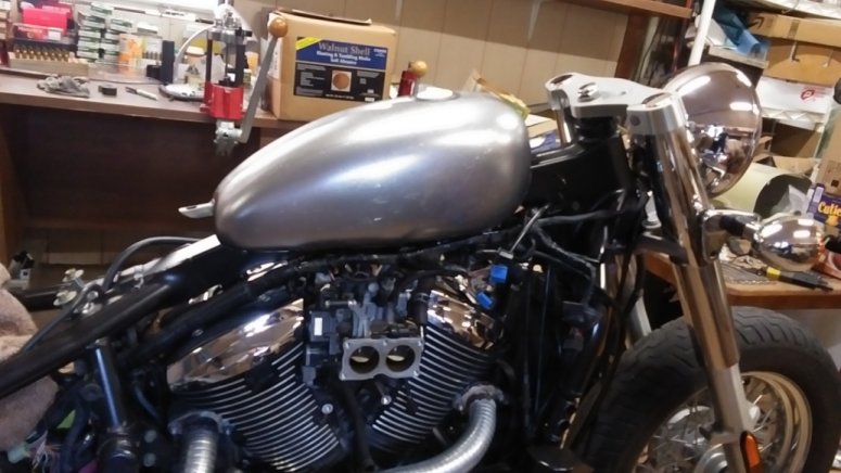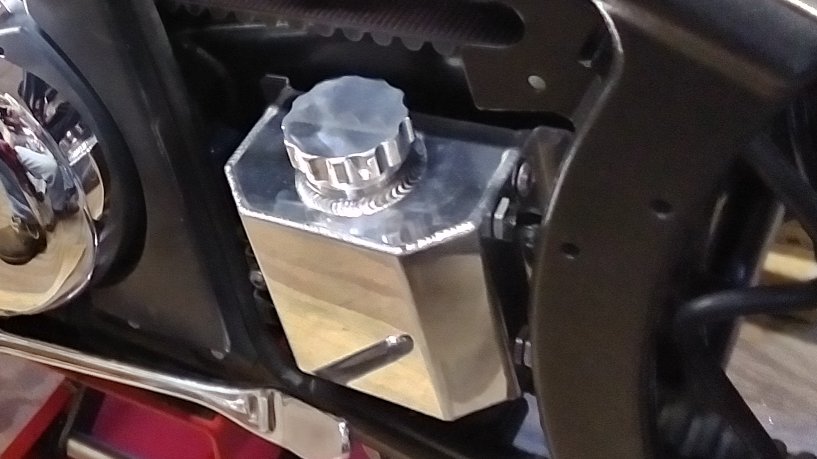 The client requested a shiny polished aluminum tank to replace the OEM part. Fitment was very close and we had to get creative with the brackets but in the end, the slightly bigger tank does not interfere with the final drive belt or kickstand and the fittings protrude just right. |