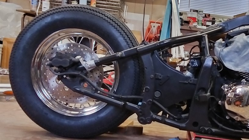 Our options for the rear wheel were slim. The problem we needed to solve was simple. The customer requested the rear rim to match the front. The front rim size is a 16"x3". Japanese cruiser motorcycles use 36-spoke wheels. American rims are sold punched for 40 spokes. Lacing a 36-spoke hub to 40 holes on a rim was out of the question. We ended up sending the rear wheel off with the whole hub to be custom laced to a plain rim that was not drilled yet. |