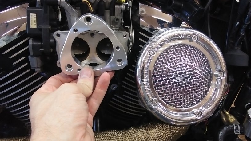 and would match the vintage style of the motorcycle were slim if not none. The solution was to buy a part intended for a HD and adapt it to fit the original throttle body. A thin adapter plate made of billet aluminum was the sensible choice here. |